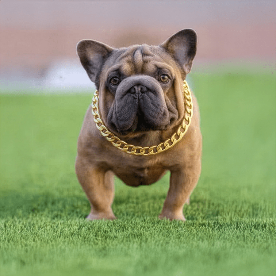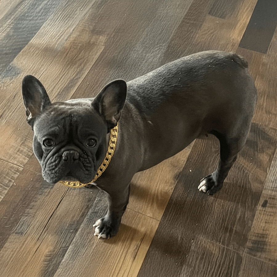 Fawn French Bulldog female for sale at Zook’s Frenchies & Doxies in Fort Plain NY standing on wood floor wearing gold chain collar