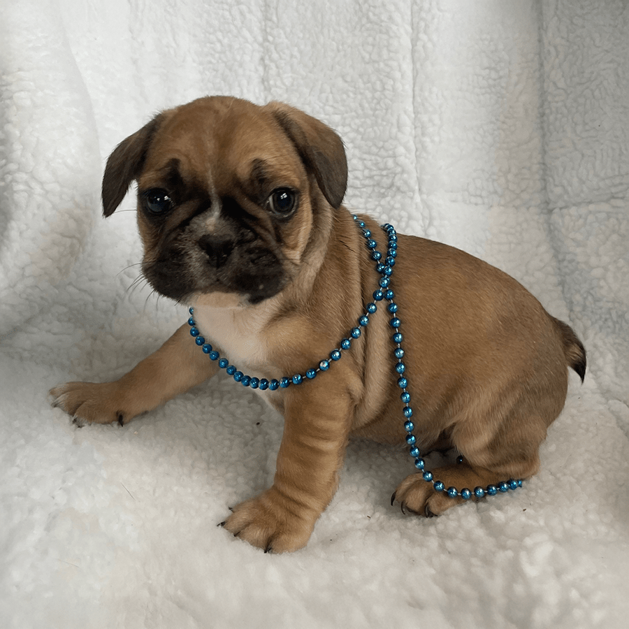 Fawn French Bulldog puppy wearing a purple bead necklace at Zook’s Frenchies and Doxies in Fort Plain, NY.